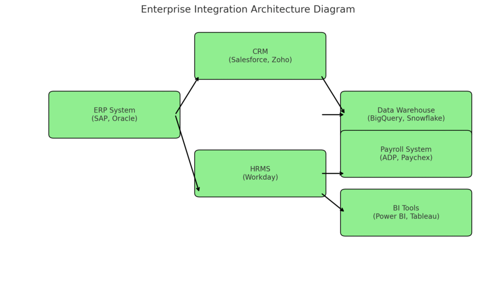At Precision Information Technologies, we help enterprises modernize their architecture by integrating ERP, CRM, HR, and analytics systems to work seamlessly together. Here’s a deep dive into strategies, real use cases, code examples, and a custom visual of an enterprise integration framework.